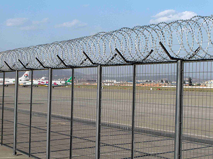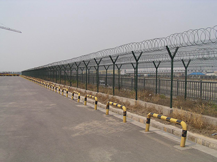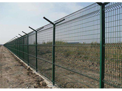 飛行區(qū)鋼筋網(wǎng)圍界一般采用5.0mm的優(yōu)質(zhì)低碳鋼絲焊接;網(wǎng)孔(mm) 50x100 50x150 50x200網(wǎng)片中帶有Y型加強(qiáng)筋可增強(qiáng)護(hù)欄網(wǎng)的抗沖擊力。立柱為60X60矩形鋼,頂端含有Y型支架或者采用70mmX100mm的掛式連接立柱,飛行區(qū)鋼筋網(wǎng)圍界網(wǎng)片鏈接采用特制SBS扣件,有效防止人為破壞性拆卸,產(chǎn)品均為熱鍍鋅后采用高質(zhì)量的聚酯粉末靜電噴涂,采用國際流行的RAL顏色,飛行區(qū)鋼筋網(wǎng)圍界主要用途:機(jī)場封閉 、私人地域、軍事重地、 場區(qū)圍網(wǎng)、 開發(fā)區(qū)隔離網(wǎng)使用;